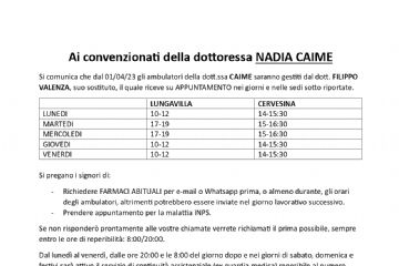 Si pubblica comunicazione per gli assistiti della Dott.ssa Caime