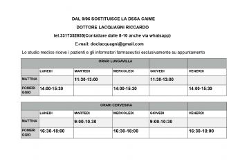 Orari ambulatorio dott. Lacquagni Riccardo che dal 9/06 sostituisce provvisoriamente la dott.ssa Caime