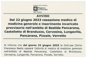 Si allega comunicazione dell 'Ats di Pavia in merito alla cessazione dall'attività di medico di medicina generale della dott.ssa Francesca...